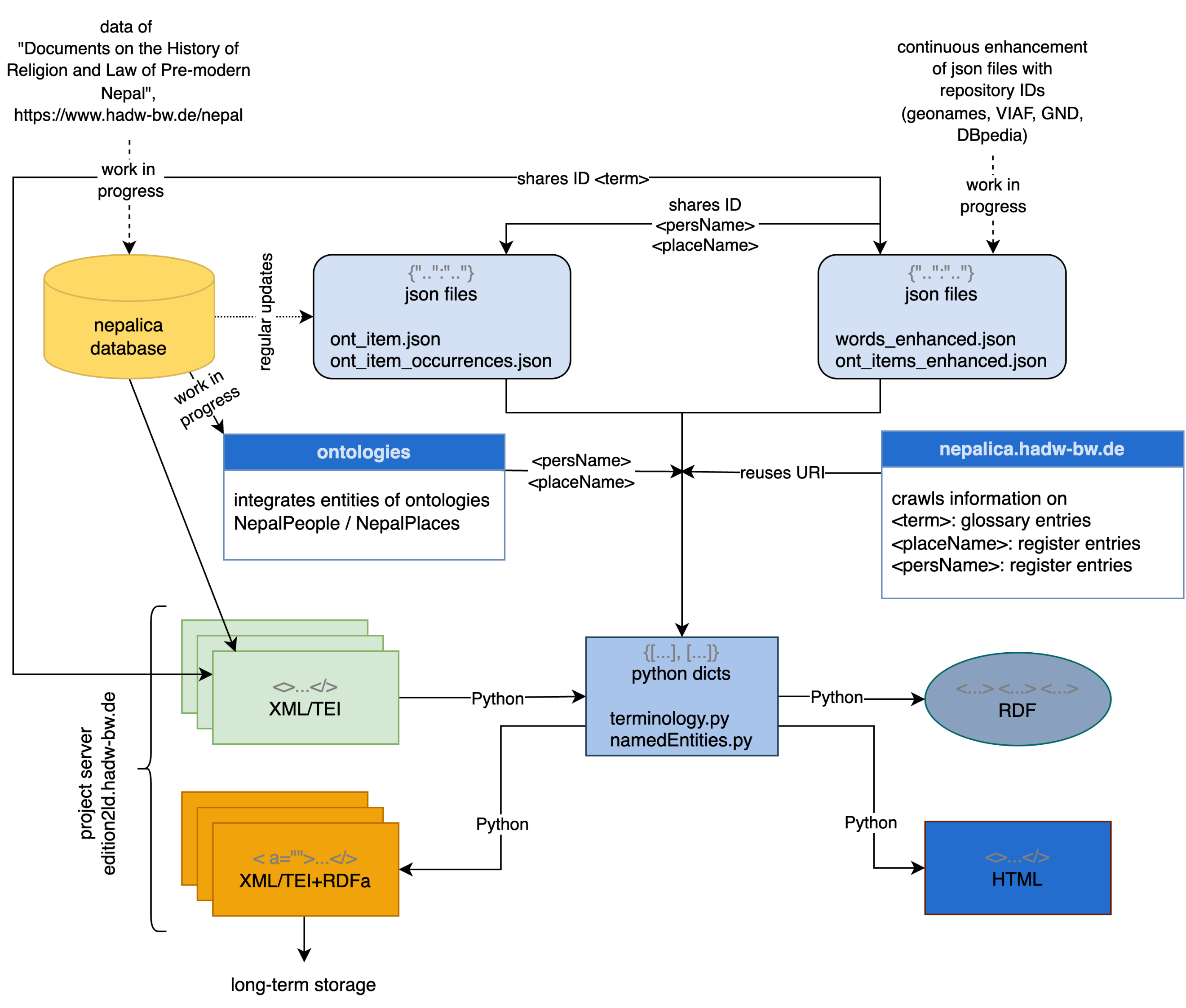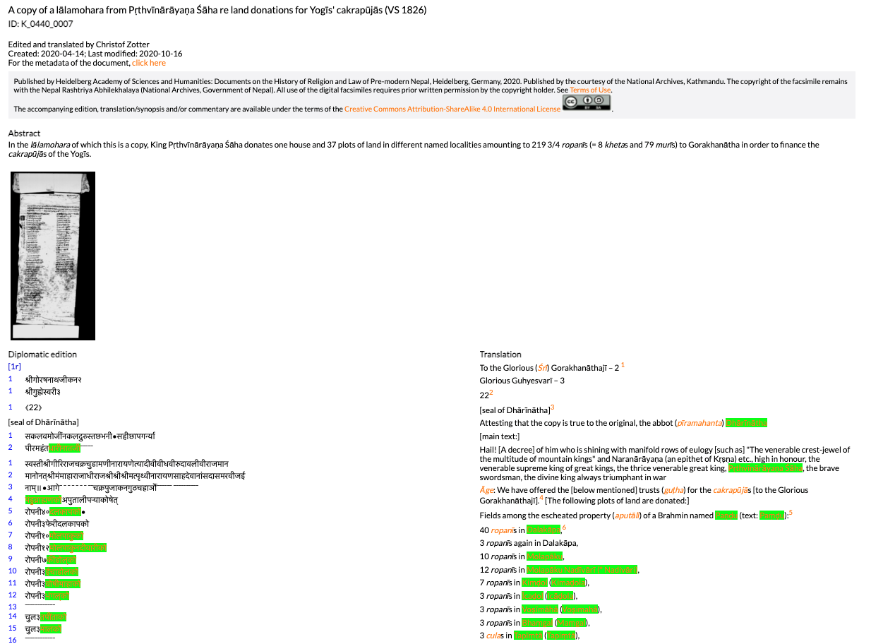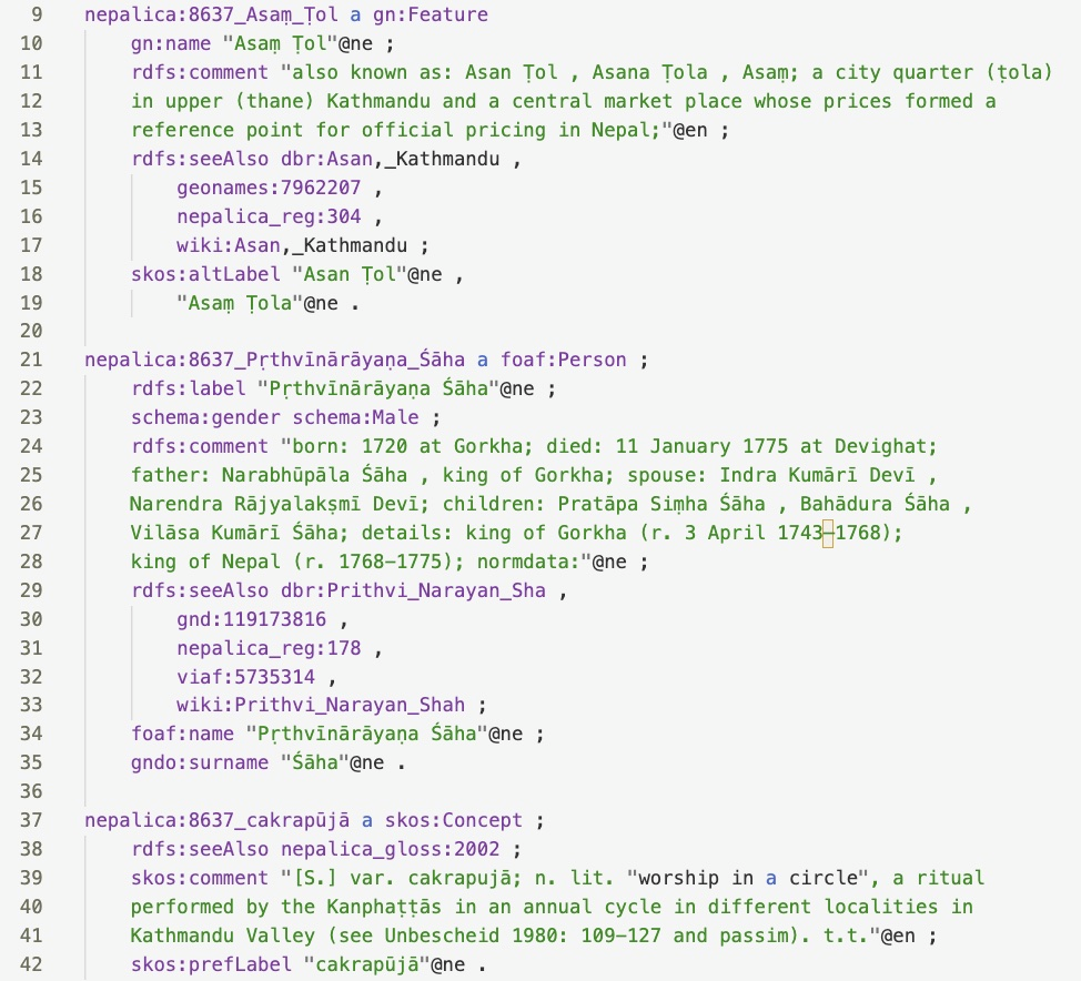 Um den Workflow für die Linked Data (LD)-Modellierung zu erarbeiten, wählt das Projekt als Anwendungsfall die Editionen der Forschungsstelle „Religions- und rechtsgeschichtliche Quellen des vormodernen Nepal“ (Nepal-FS) der HAdW. Die Forschungsstelle erstellt digitale Editionen der Nepali-Texte (in Devanagari-Schrift) inklusive Faksimiles, englische Übersetzungen (in lateinischer Schrift), Kommentare und Registereinträge (Personen, Orte, Fachtermini).